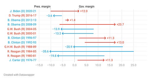 Now, the degree of that swing has varied quite a bit. In 2021, Republican Glenn Youngkin won by about 2 percentage points over McAuliffe (who sought to win back his old office), a margin that was 12 percentage points better than President Donald Trump’s 10-point defeat against Joe Biden in Virginia a year earlier. But in 2017, Democrat Ralph Northam handily beat Republican Ed Gillespie by about 9 points, roughly a 4-point improvement on the Democrats’ 2016 margin of victory in Virginia.